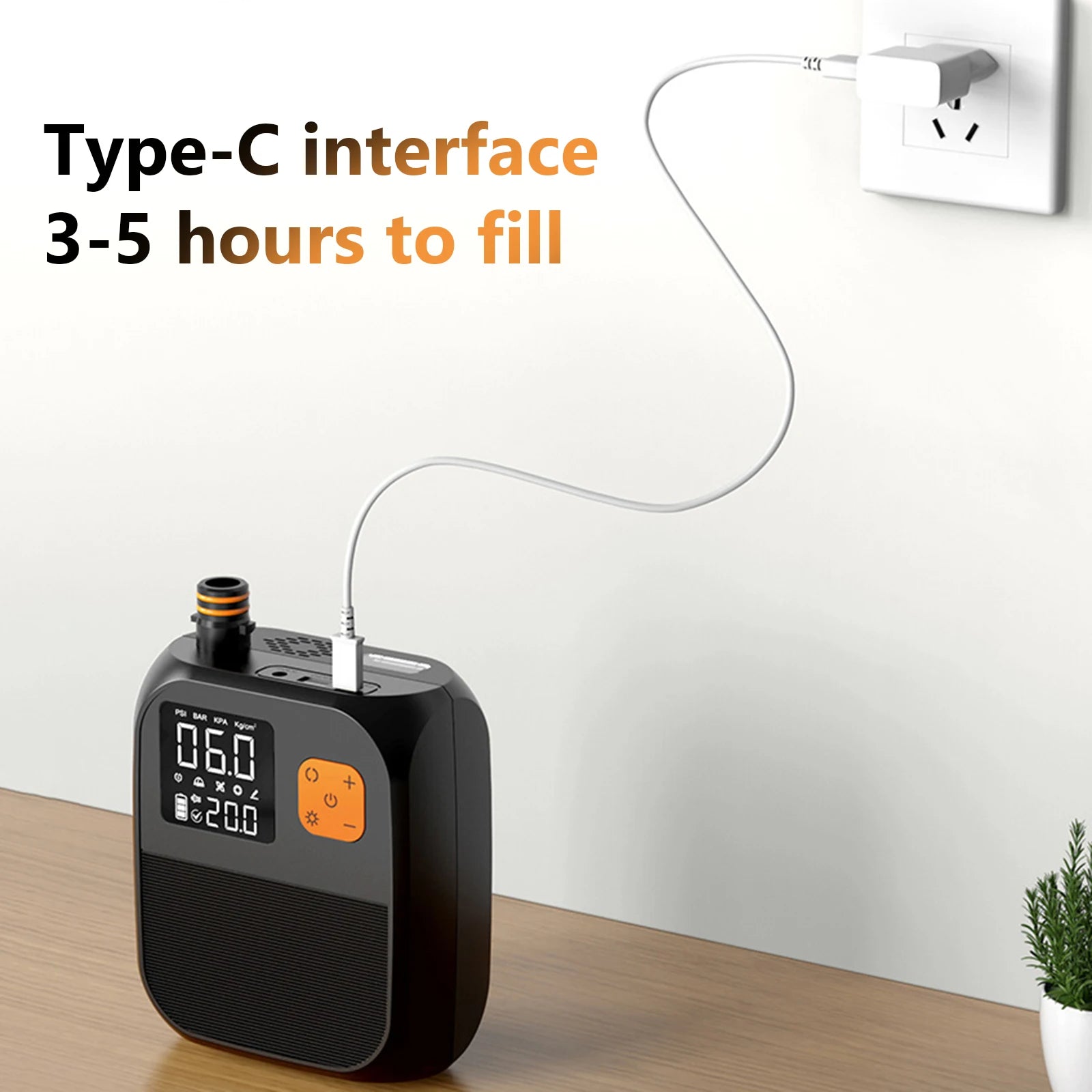 4.Segmented Inflation: This portable electric pump adopts segmented inflation for higher efficiency. The first stage quickly inflates the item up to 1PSI before switching to high-pressure inflation, stopping automatically at the preset value.