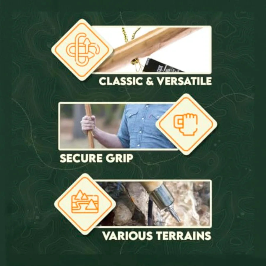 hard steel tip , walking stick for support while hiking and walking on uneven ground.